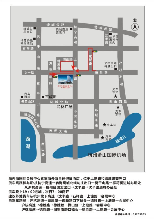杭州海外海国际会议展览中心位于杭州市区城北部拱墅区中心地段(上塘路和德胜路交叉路口)。古老而秀美的京杭大运河穿境而过。会展中心门前的上塘高架路和德胜快速路贯通杭城东西南北,可直达西湖、市商业中心和杭州火车站、杭州萧山国际机场,并直接延伸至沪杭甬高速和杭宁高速公路。交通方便、快捷、流畅,使人流、货流、车流能够快速集散。