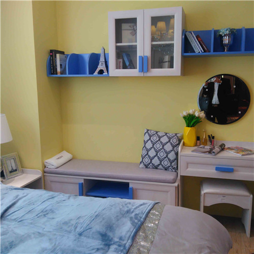 \u00A0美式家具搭配在近几年也开始越来越受人们的喜爱。深蓝的色调和复古的搭配非常适合男孩子,美式家具多以沉稳、大气而著称。皮革、实木更是常用材料。这些硬朗的材料更能体现难孩子的性格,而且地毯、墙纸这样的相对环保的材料用来打造儿童房也更加具有安全性也更有保障。所以家具搭配时色调的选择要注意,家具选择了美式风格经典的蓝色,与红色搭配。深蓝色、浅蓝色、白色、红色相互穿插让空间看起来缤纷多彩。