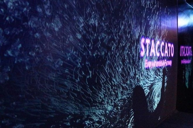 有别于以往明亮通透的快闪店,此次思加图打造的集装箱快闪店整体色调黑暗神秘。门店内部聚集了12000束激光,顾客只要穿了STACCATO的鞋进去,灯光就会感应到。同时,根据顾客穿的鞋子不同,灯光还有多种花样。