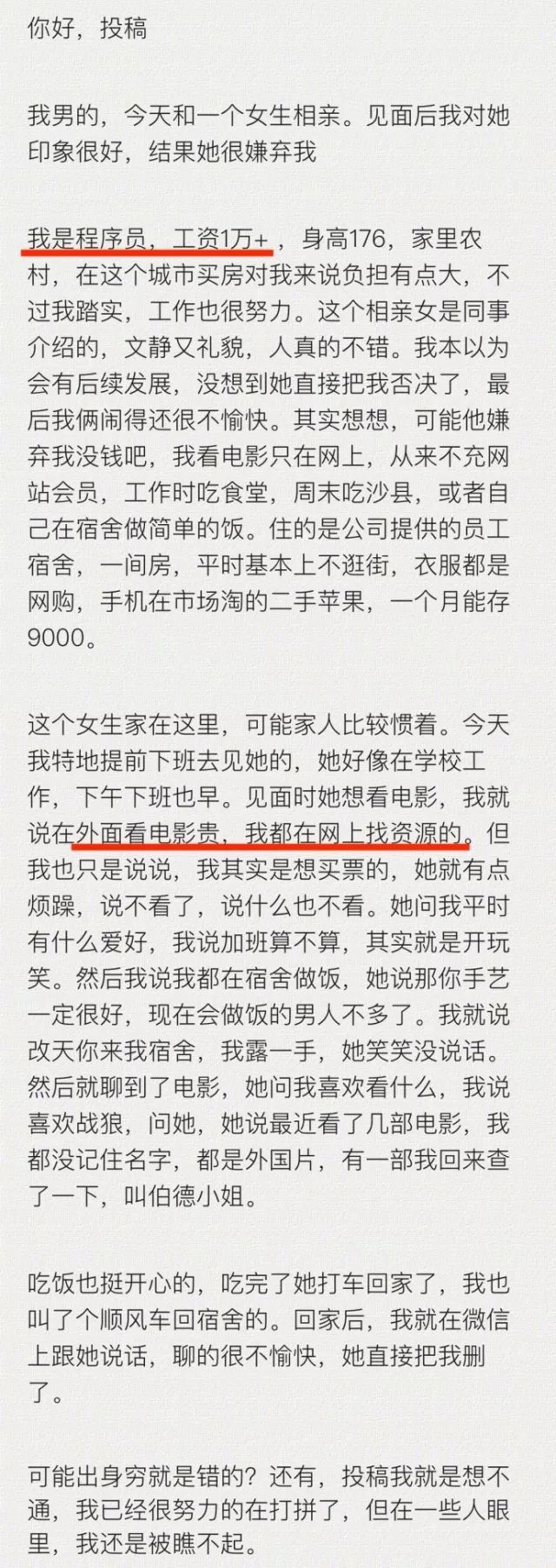 各种相亲时的奇葩故事,大家是喜闻乐见了,毕竟奇葩共赏,快乐无边,最近,就有一位男网友在网上发帖讲述了自己的一次相亲经,究竟是女孩子太过物质?还是这名程序员情商太低?我们来探一探。