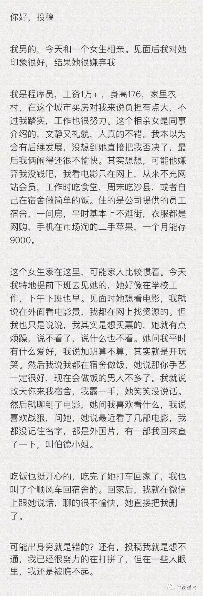 一男生投稿吐槽说自己相亲的女孩太物质
