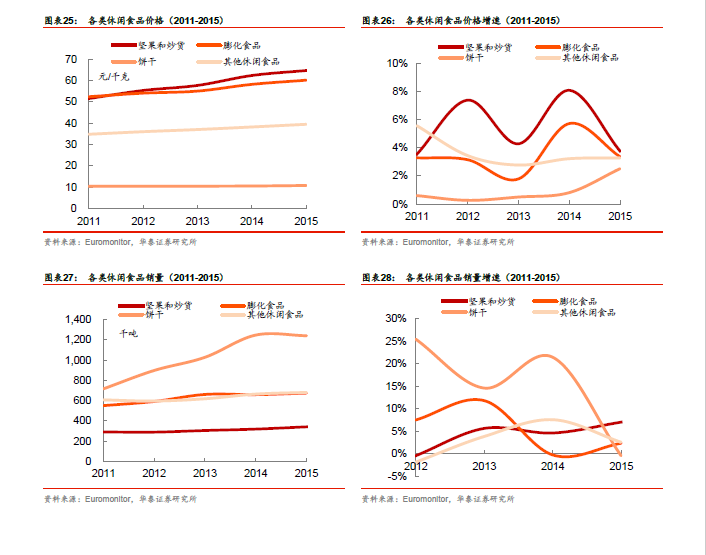 周黑鸭和煌上煌也都具备以上的特性,两者都属于休闲食品中的休闲卤制品,这几年的增速尤其明显。根据Euromonitor数据,我国休闲食品从2011年到2015年近五年的复合增长率达10.51%,而休闲卤制品在这期间内的复合年增长率为17.6%。