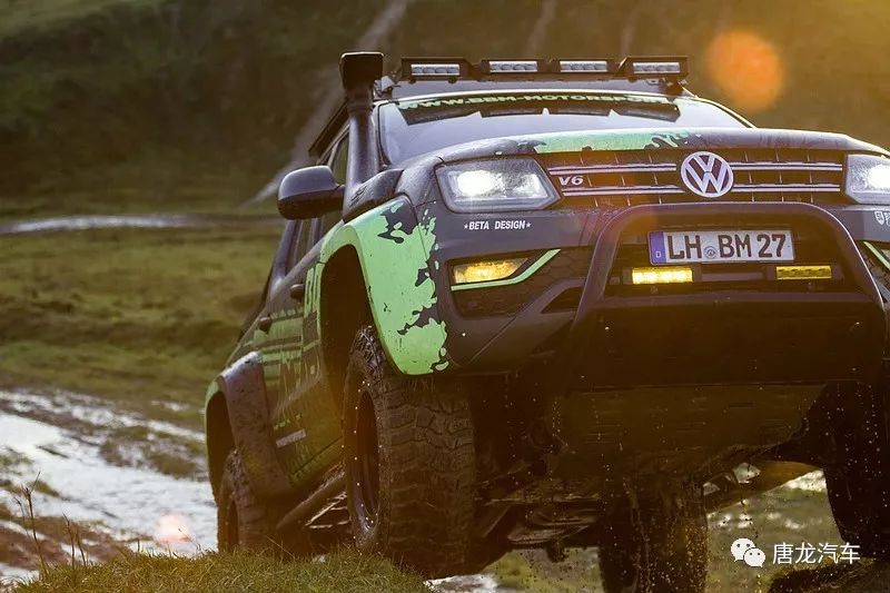 这辆由BBM Motorsport操刀改造的Amarok V6,在外观方面首先藉由换装Delta 4×4车身抬举系统增加100mm的高度,搭配加装车头/车侧防护杆、宽体叶子板/外扩轮拱、前后下护板、LED投射灯、进气呼吸管等部品,搭配18寸铝圈以及尺码为305/60-18的Cooper STT Pro越野胎,甚至还可选择将车高再提高40mm,并换上更大的305/70-18尺寸配胎,最后于车身师以亮眼的绿色彩绘,造就出相当抢眼的风貌。