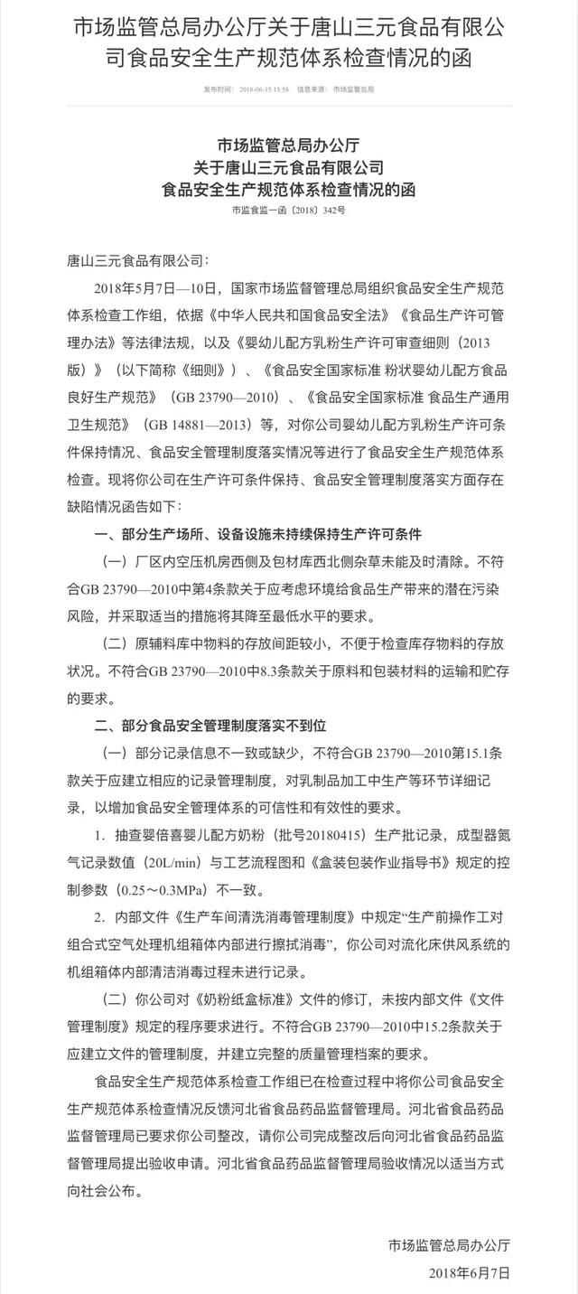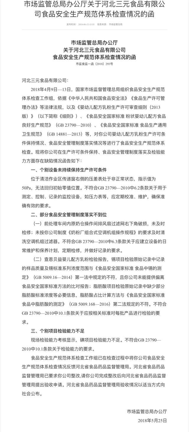 而在河北三元食品有限公司的检查情况的函中写到,前处理车间内原奶仓操作间排风扇过滤网右下角破损,未及时检修。除此以外,还有“部分食品安全管理制度落实不到位”、“个别项目检验能力不足”等三项安全生产缺陷。