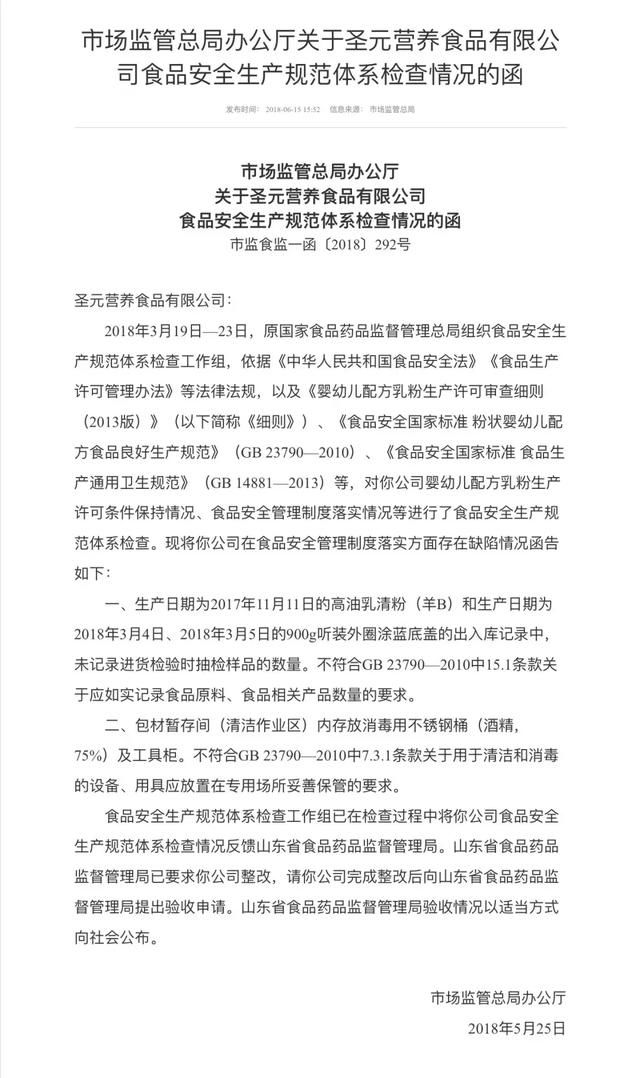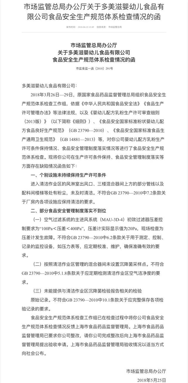 然而,在不到三个月后,国家市场监督总局近日公布了多家婴幼儿配方奶粉生产企业安全生产规范体系检查情况,公告表示,国家市场监督管理总局对多美滋、圣元、三元、伊利、贝因美共5个婴幼儿奶粉品牌、6家婴幼儿奶粉生产企业的婴幼儿配方乳粉生产许可条件保持情况、食品安全制度落实情况等进行了食品安全生产规范体系检查。检查结果显示,这5个品牌在生产许可条件保持、食品安全管理制度落实等方面都存在缺陷情况。