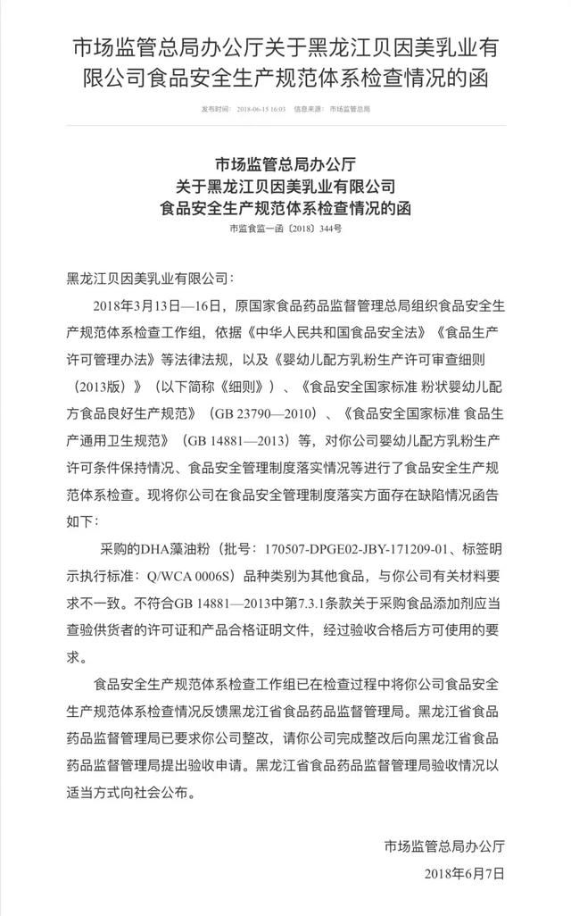 这次生产规范体系检查非常细致,从对国标的执行情况、产品储存要求,到原料存放条件、个别设备的维持情况等,都有涉及。例如在对黑龙江贝因美乳业有限公司的检查情况的函中就写到,采购的DHA藻油粉(批号:170507-DPGE02-JBY-171209-01、标签明示执行标准:Q/WCA 0006S)品种类别为其他食品,与你公司有关材料要求不一致。不符合GB14881-2013中第7.3.1条款关于采购食品添加剂应当查验供货者的许可证和产品合格证明文件,经过验收合格后方可使用的要求。
