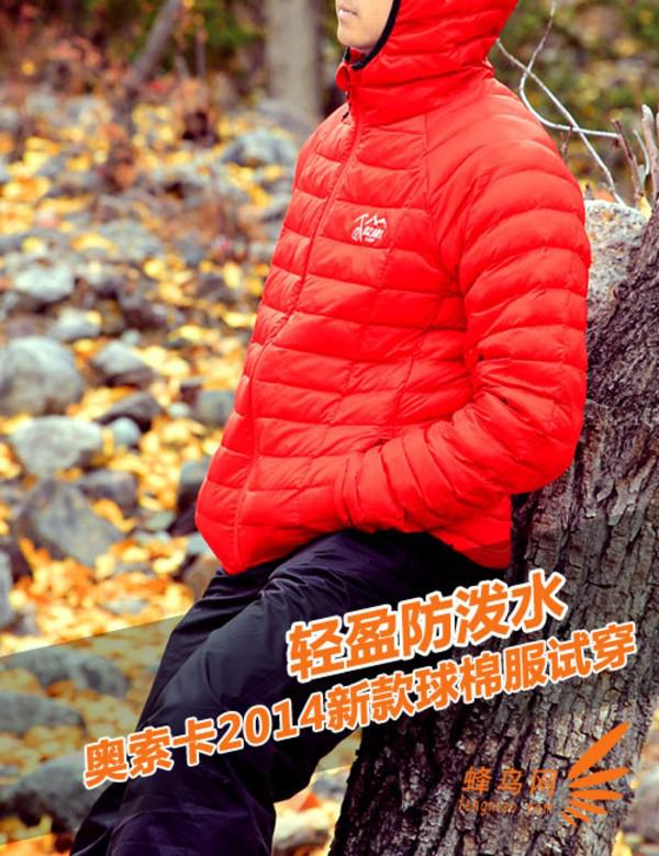我所穿着的奥索卡2014秋冬款球棉服从外形上看,与大家常见的轻型羽绒服非常类似,采取“米其林”造型区域固定保暖材料。衣服自备帽子,即可遮风挡雨,又可保暖。