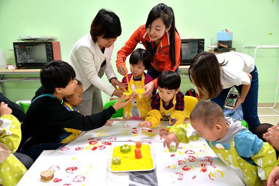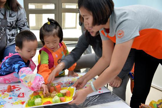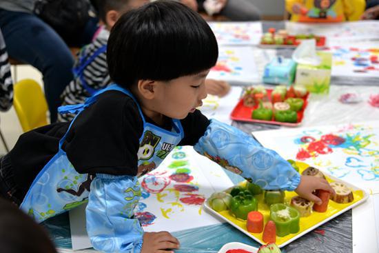 尊老爱老是中华民族的传统美德,也是幼儿品德教育的一项重要内容。值此重阳节,红黄蓝西城区幼儿园举办了一场别开生面的亲子DIY创意活动,60余名孩子利用切成段的莲藕、青椒、胡萝卜、小青菜,蘸上红黄蓝不同的油彩,通过“盖章”的方式,勾勒出一幅幅充满童趣的作品,送给长辈作为礼物。
