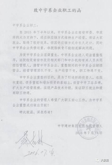 7月14日,中宇建材集团有限公司管理人发布《关于中宇系企业继续营业的函》及《致中宇系企业职工的函》两份函件。函件表明,中宇系企业进入司法重整程序,法院指定南安市政府相关部门和社会中介机构共同组成的中宇建材集团有限公司清算组担任管理人,接管中宇系企业。
