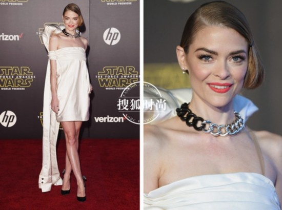 演员JaimeKing12月14日出席《星球大战:原力觉醒》好莱坞首映礼,银、黑双色链状Choker搭配白色礼裙,有没有星球大战的科幻即视感。