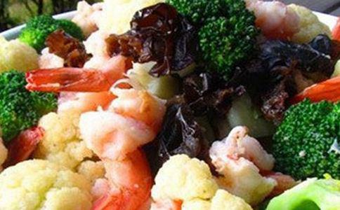 准备材料:虾300克、西兰花200克、菜花200克、鲜木耳50克、鸡蛋白(半个)、食盐4克、姜5克、生粉5克、胡椒粉3克、植物油适量。
