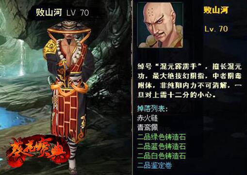 在乐趣网《葵花宝典》中,败山河共有两重省份,一是挑战BOSS,一是酒馆侠客。作为挑战BOSS,败山河是所有侠士前期都比较憎恨,乃至每天都想轮他一百遍的角色。主要掉落六十级首饰的合成部件,以及武林中十分珍贵的铸造石。