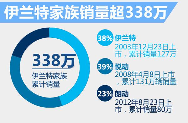 北京现代于2003年12月23日正式推出了第一代伊兰特,这款车打开了伊兰特家族在中国的市场。接下来,北京现代又相继推出了换代车型——悦动、朗动,这三款车凭借三大法宝,即时尚潮流、性能实用以及品质保证,共同完成了累计超过338万辆的销量。“在中国,伊兰特、悦动、朗动早已成为中国市场长期热销的主流车型,累计销量已超过338年辆,无论在全球市场还是中国市场,这些数据仅仅证明伊兰特家族产品的深入人心,以及现代汽车产品品质和品牌的强大实力。”