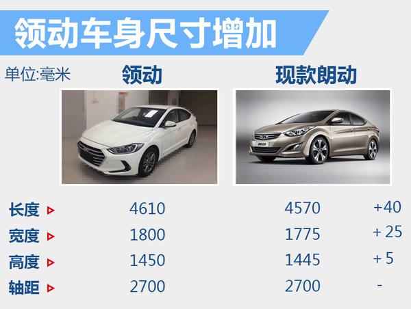 北京现代现款朗动定位A级轿车,车身尺寸为4570*1775*1445毫米,轴距为2700毫米;领动作为现款朗动的换代车型,在车身长度方面进行了升级。新车车身尺寸长宽高为:4610*1800*1450毫米,轴距为2700毫米;相比之下,领动车身长度增加40毫米,宽度增加25毫米,高度增加5毫米,轴距并没有发生变化。