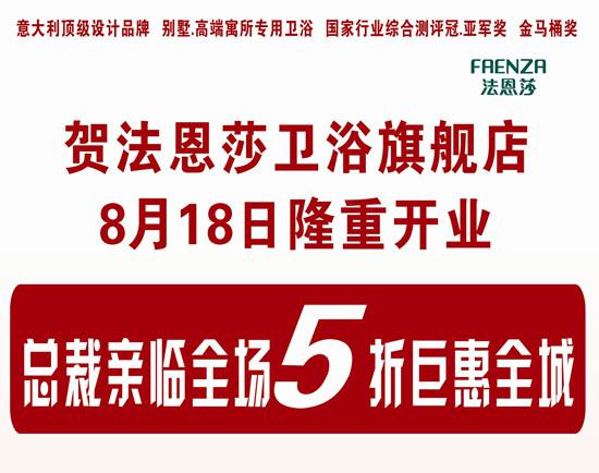 经过近两个月的重新装修,法恩莎卫浴郑州凤凰城600平米旗舰店将于8月18日闪亮登场。本次的重装开业,是自2008年8月18日以来的第三次盛大开业活动,时值开业5周年纪念日,郑州旗舰店将以空前绝后之盛势,推出史无前例的优惠狂潮!
