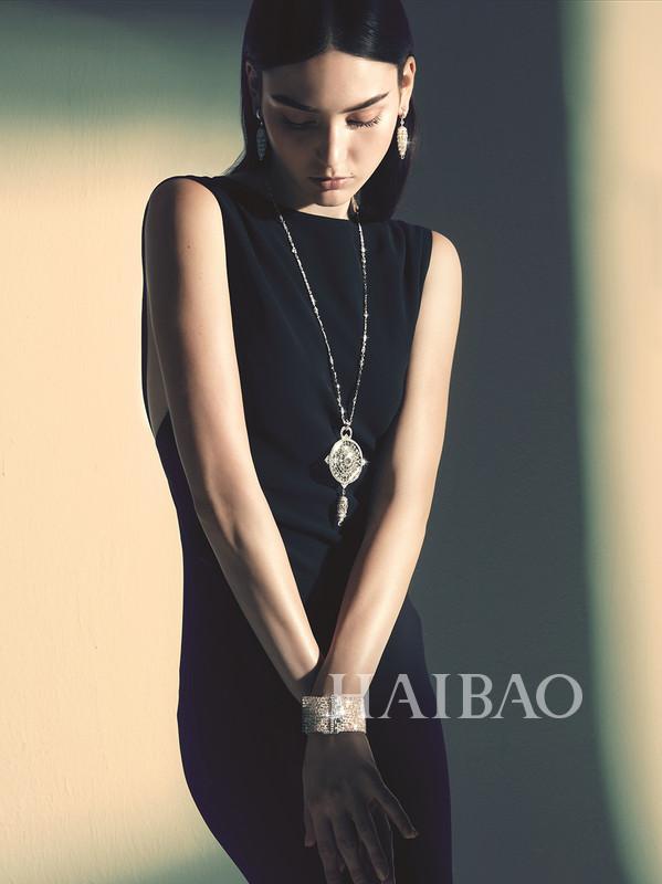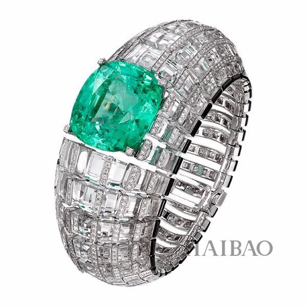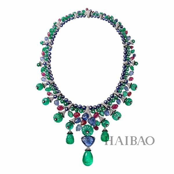铂金,雕刻哥伦比亚祖母绿重37.37克拉,2颗雕刻水滴形雕刻祖母绿共重 40.98 克拉,三角形雕刻蓝宝石重24.13克拉