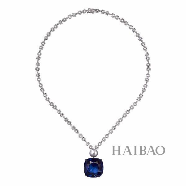 铂金,1颗重44.47克拉的阶梯式切割枕形蓝宝石,1颗重20.40格令的淡灰色天然珍珠,玫瑰形切割钻石,重 4.22克拉,明亮式切割钻石