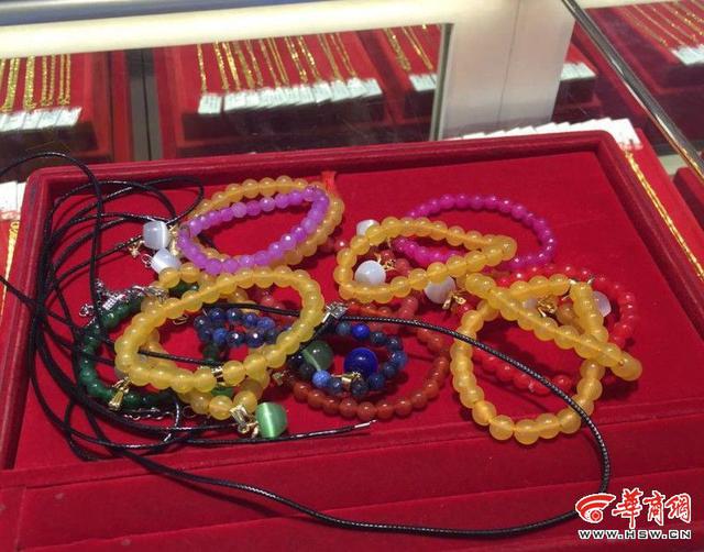 今天下午3时,记者来到这家老凤祥金店,一位女店员听闻是领礼品,立即端出一个盘子,盘中有广告里提到的“小苹果”吊坠,叶子是镀金的,还有各种颜色的手链和黑绳,女店员说,必须买5元的黑绳或者20元的手链才能领走礼品“小苹果”。