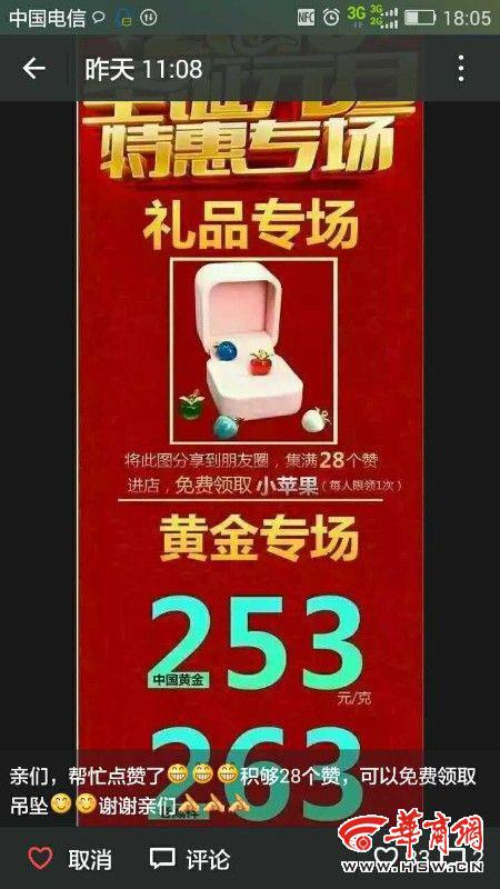 几天前,家住西安城西红光路附近的赵女士听朋友说,在朋友圈帮红光路和平村附近一家老凤祥金店发广告,集赞满28个就能免费领一个“小苹果”吊坠。广告图片显示,活动礼品是一个小苹果造型的吊坠。12月16日,赵女士在朋友圈发了这则广告,到12月19日已经有33个赞,19日晚上,她按照广告上的地址去了这家老凤祥金店,刚咨询领“小苹果”礼品的事情,就有店员说想领小苹果,必须买一根5元的黑绳或者20元的玛瑙手链,可以把“小苹果”挂在上面。赵女士说,当时店里有十多个女孩子也是去领礼品的,有些想拿到“小苹果”,就又买了黑绳或者手链,也有人不想买就转身走了。赵女士认为,“广告上都说是免费领小苹果,可谁知还有附加条件。帮这家店在自己朋友圈做了宣传,但是他们却欺骗消费者。”