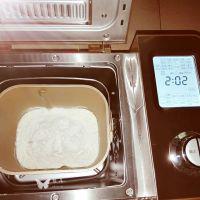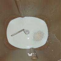 2. 在面包桶里加入牛奶和白糖。