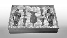 礼盒内是金黄绸缎环抱两瓶248ml国花瓷12年喜庆装,以及一套酒具,酒具是一个分酒器及4个红色小酒杯组成的五件套。红黄相衬,再以瓶身上的绿叶为点缀,简直像艺术品般美不胜收。两瓶248ml国花瓷12年也寓意好事成双,鸿运双至。