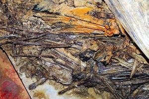 为便于棺柩的清理发掘工作,增加内棺考古作业的空间,昨日考古人员再次对棺柩东壁的椁板进行了提取。在前期清理中,为了防止倒塌,主椁室紧贴棺柩东壁的椁板并没有提取完,而随着内棺的清晰呈现,要继续对内棺清理,就必须要拆除东侧的椁板,增加考古作业的空间面积。