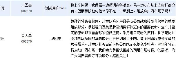 全景网11月11日讯 周三贝因美(002570)在全景网互动平台上表示,儿童奶业务目前正按公司既定规划稳步推进,2016年预计将启动广西市场。