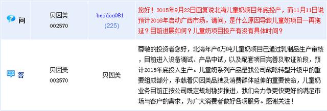 全景网11月23日讯 贝因美(002570)周一在全景网互动平台上回答投资者提问时透露,北海年产6万吨儿童奶项目已通过乳制品生产审核,目前进入设备调试、产品中试,以及配套项目完善及取证阶段,预计2015年底投入生产。