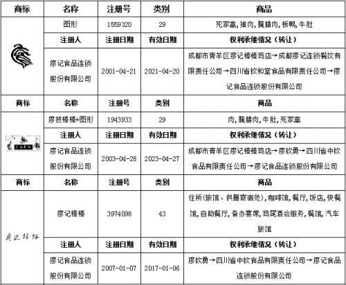 廖家三兄弟也于2000年在成都开设起廖记棒棒鸡门店,并在2001年注册(廖技棒棒)商标招徕生意。廖家三兄弟又于2012年9月注册现在的廖记食品连锁股份有限公司,并将其注册的(廖技棒棒)商标在店招上大量使用。