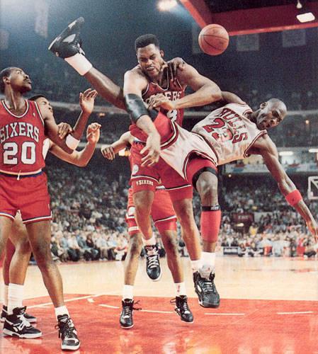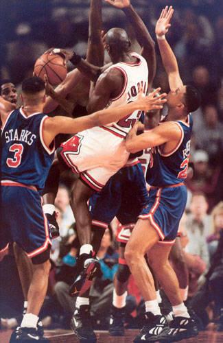 单防乔丹实在是难以奏效,因此在比赛中,乔丹遇到的防守人往往都不是一个,以一敌三、以一敌四实在太常见。