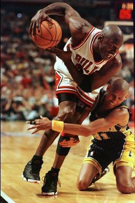 雷吉-米勒和乔丹可是死对头,赛场上架也打过,垃圾话也喷过,即便是跪倒在地,雷吉-米勒也不能让乔丹轻松突破,拉住腿也得把你拦下来!