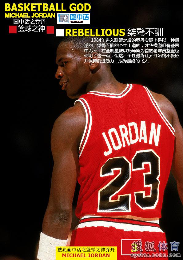 3-画中话之篮球之神乔丹-桀骜不驯 3.叛逆者 1984年进入联盟之后的乔丹实际上是以一种叛逆的、桀骜不驯的个性出道的,才华横溢但有些目中无人,在全明星被以托马斯为首的老球员整蛊也说明了这一点,但这种个性最终让乔丹始终不妥协并保持前进动力,成为最终的飞人。