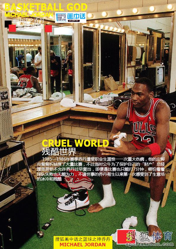5-画中话之篮球之神乔丹-残酷世界 5.残酷世界 1985—1986年赛季乔丹遭受职业生涯惟一一次重大伤病,他的左脚舟骨骨折缺席了大量比赛,不过当时公牛为了保护自己的“财产”总经理克劳斯不允许乔丹过早复出,即便是比赛也只能打7分钟,哪怕看着球队失败也无能为力,不谙世事的乔丹有生以来第一次感受到了生意场的冰冷和残酷。