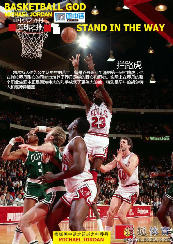 6-画中话之篮球之神乔丹-拦路虎 6.拦路虎 凯尔特人作为公牛队早年的苦主,曾是乔丹职业生涯的第一只拦路虎,他在撕咬乔丹耐心的同时也培养了乔丹足够的野心和恒心。实际上在乔丹的整个职业生涯中正是因为伟大的对手成就了更伟大的他,特别是早年的凯尔特人和底特律活塞。