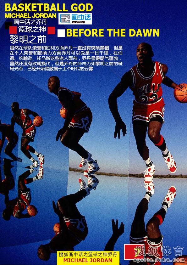 7-画中话之篮球之神乔丹-黎明之前 7.黎明之前 虽然在球队荣誉和胜利方面乔丹一直没有突破禁锢,但是在个人荣誉和影响力方面乔丹可以说是一日千里,在伯德、约翰逊、托马斯这些老人面前,乔丹显得朝气蓬勃,虽然还没有改朝换代,但是乔丹的冲击力如黎明之前的斑斑光点,已经开始驱散属于上个时代的云雾。