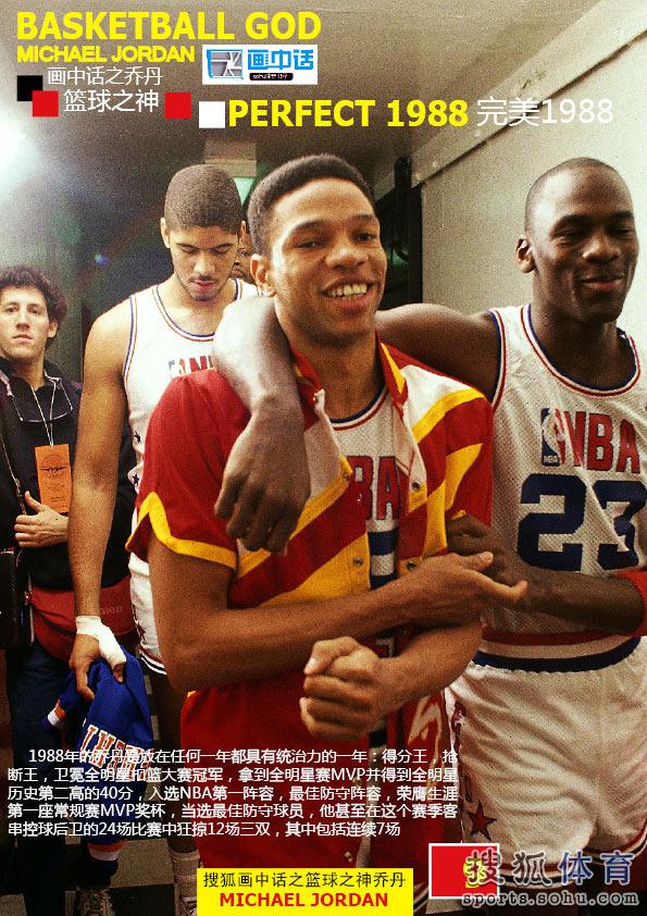 9-画中话之篮球之神乔丹-完美1988 9.迈克尔的1988 1988年的乔丹是放在任何一年都具有统治力的一年:得分王,抢断王,卫冕全明星扣篮大赛冠军,拿到全明星赛MVP并得到全明星历史第二高的40分,入选NBA第一阵容,最佳防守阵容,荣膺生涯第一座常规赛MVP奖杯,当选最佳防守球员,他甚至在这个赛季客串控球后卫的24场比赛中狂掠12场三双,其中包括连续7场。