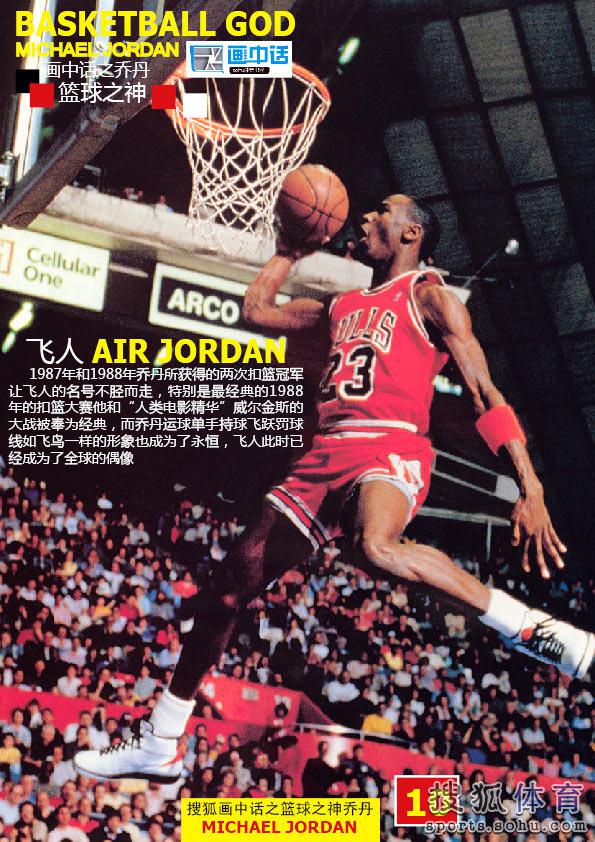 10-画中话之篮球之神乔丹-飞人 10.飞人 1987年和1988年乔丹所获得的两次扣篮冠军让飞人的名号不胫而走,特别是最经典的1988年的扣篮大赛他和“人类电影精华”威尔金斯的大战被奉为经典,而乔丹运球单手持球飞跃罚球线如飞鸟一样的形象也成为了永恒,飞人此时已经成为了全球的偶像。
