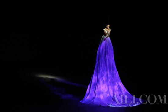 随着一抹蓝韵映入眼帘,整场秀剧的高潮——“思海梦”系列的亮相演绎出深海世界的神秘魅力。设计师将深海之中谜蕴莫测、奇妙变幻的自然景象作为本次设计系列的灵感精髓,大胆的用色层次更迭、对比明烈却丝毫不失协调,运用优雅细腻的月光白与华美古典的磨砂金结合以沉遂迷离的深海蓝,更点缀上明快娇艳的珊瑚橘、水草绿,将深海中一切随波荡漾闪烁的色彩展现的惟妙惟肖,带来独特新颖的视觉效果;柔亮的丝光缎加以清透的细网纱,精巧的花边融合细致的钉珠,现代装饰元素碰撞古典艺术的细节,立体造型的剪裁将性感魅惑与华丽高贵的韵味完美诠释。而整场秀的尾声,一件纯白的拖尾曳地长裙由穿着的舞者飞悬于空中展现给观众,奇幻的光彩投射于纯粹雪白的长裙之上,震撼炫目,惊艳压轴这场前卫时尚的发布会。