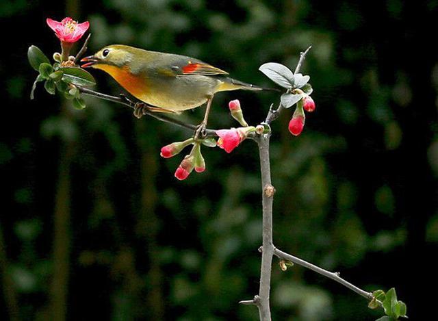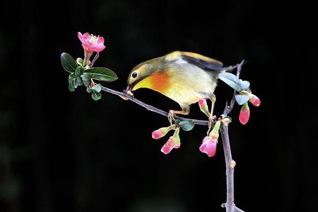 校园小树林中,泥土里插一株海棠,海棠上放几条面包虫,旁边再放两个反光板,场景就设计好了。拍客们准备好“长枪短炮”,静坐等待,一旦有相思鸟飞过来觅食,立即按下快门,一张张飞鸟花间觅食的美图就拍好了。