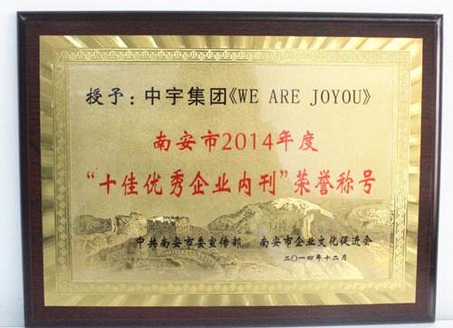 中宇卫浴:荣获南安市2014年度“十佳优秀企业内刊”12月22日,由南安市思想政治工作研究会、市企业文化促进会联合举办的南安市2014年度“十佳优秀企业内刊”颁奖仪式在南安市文化馆举行。中宇建材集团内刊《WE ARE JOYOU》荣获南安市2014年度“十佳优秀企业内刊”。