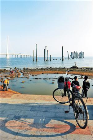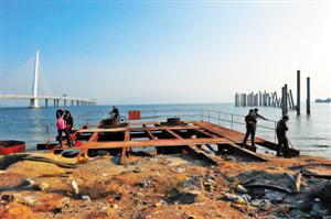 昨天下午,记者赶往此工程施工现场,现场无数巨大的水泥柱矗立在深圳湾大桥旁海里,醒目而怪异,一片杂乱。