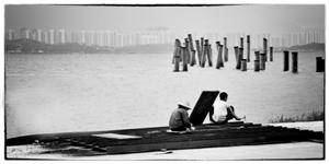 2013年1月,游玩的市民遥望海中废弃的桩柱。