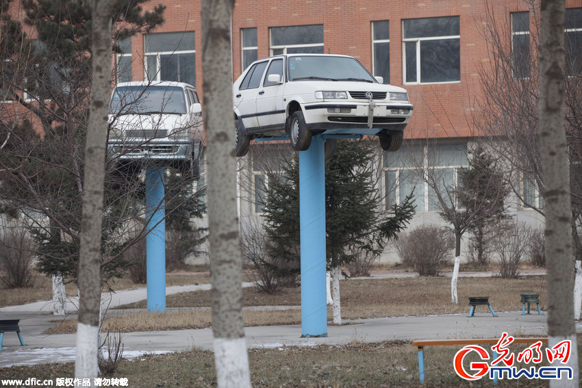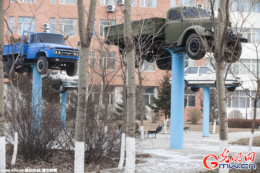 这是一个以汽车为主题的休闲广场,地面上还有一些用轮胎制成的休息桌椅,学校将广场设计成这样,是为了宣传自己的主打课程。