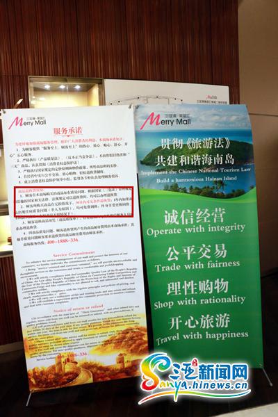 美丽汇商城入口处的消费提示牌,提示游客理性购物。三亚新闻网记者邓松摄