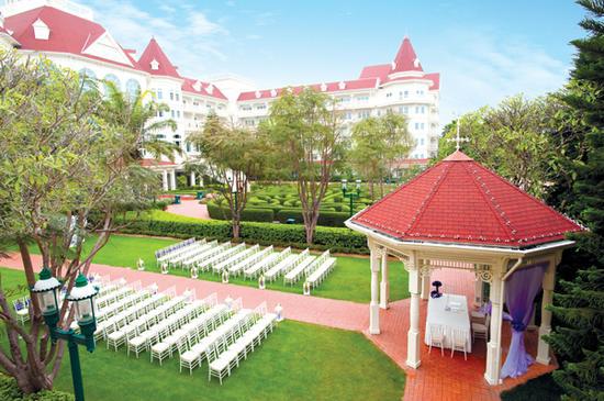 每一座迪士尼乐园都会配有一个婚礼馆,主打教堂风格,馆内装修纯白圣洁为主。也兼具迪士尼特色,例如馆外的玻璃会采用南瓜车样式。同时丧心病狂的迪士尼乐园还推出了,适合各类人群需要的婚礼场地,它们遍及乐园里的所有角落,只要能摆椅子,就能办一场婚礼。