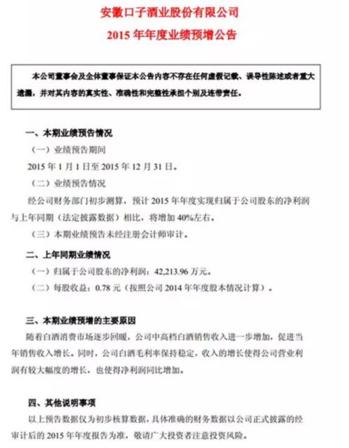该公告还表示,随着白酒消费市场逐步回暖,口子窖中高档白酒销售收入进一步增加,促进了公司2015年销售收入增长。同时,公司白酒毛利率保持稳定,收入的增长使得公司营业利润有较大幅度的增长,也使得净利润同比增加。