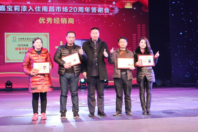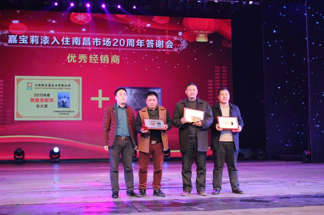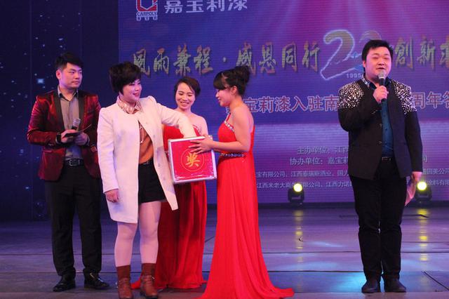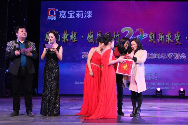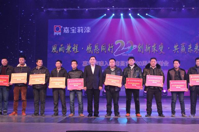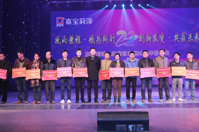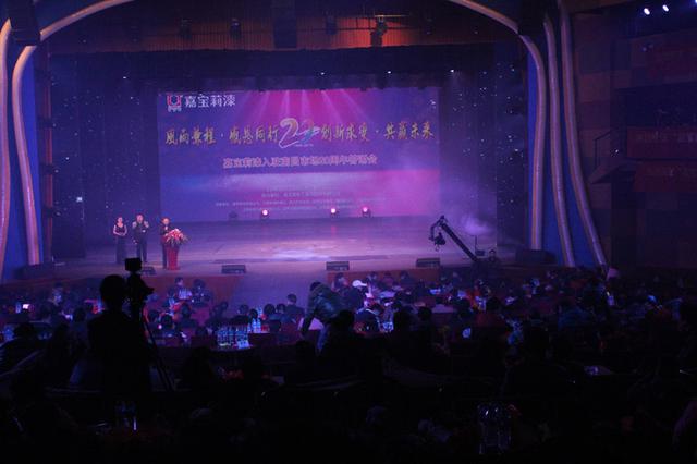 风雨兼程?感恩同行,创新求变?共赢未来,嘉宝莉漆从1995年到2015年入驻南昌市场正好20年。2016年1月28日下午,由江西陶乐嘉实业有限公司主办嘉宝莉漆化工集团股份有限公司协办的嘉宝莉漆入驻南昌市场20周年感恩答谢会于南昌琴岛之夜大剧场隆重召开。南昌嘉宝莉员工、经销商、材料商以及媒体朋友等800多人出席了本次大会。