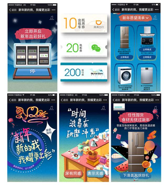 在H5互动中,用户选择自己在生活中遇到的家务难题后,即可获得相应的家务帮手推荐。西门子家电还与去哪儿网、滴滴出行和微信电影开展合作,在H5抽奖环节中,为用户提供"旅行券"、"打车券"和"电影券"等专属新年礼。最后展示西门子家电在此次活动的主推产品,用户可了解产品详情并进行购买。
