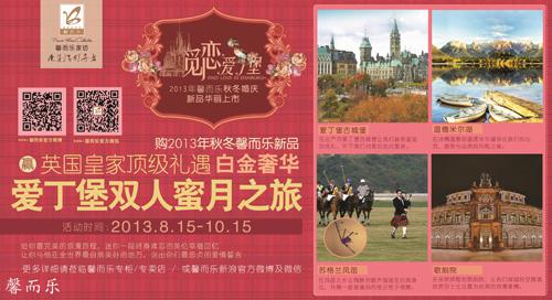 2013年8月15日—10月15日,英国皇家顶级礼遇白金奢华--爱丁堡双人蜜月之旅,是馨而乐家纺送给新人们最完美的豪华蜜月旅行,牵起她的手,与馨而乐一起走向幸福吧!