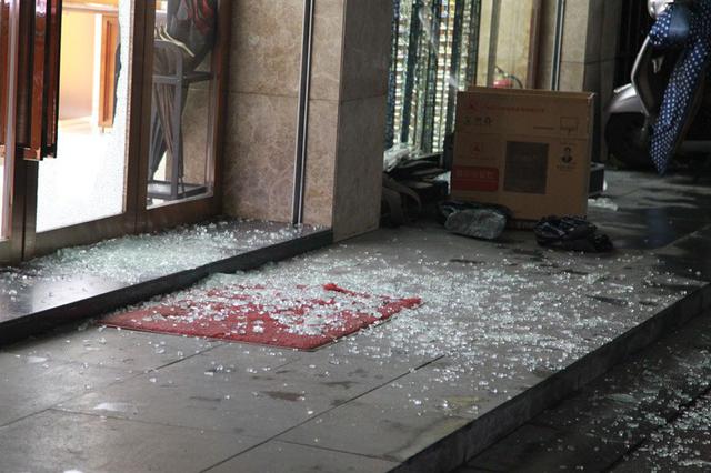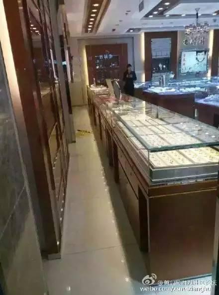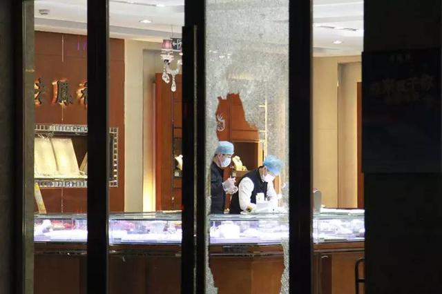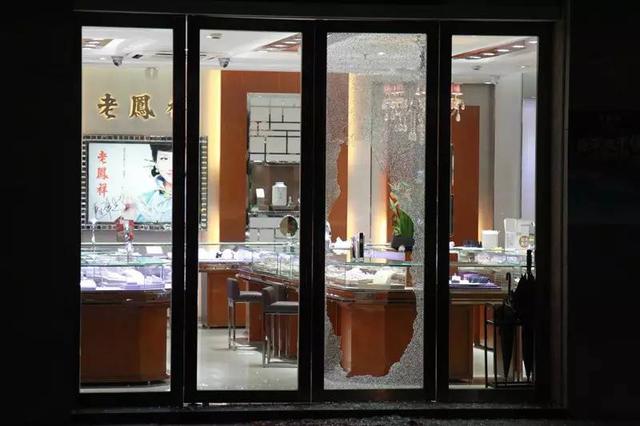 在现场可以看到,一楼的老凤祥金店大门口的玻璃门被敲出了一个大窟窿,店内一柜台里的金器已不见踪影……